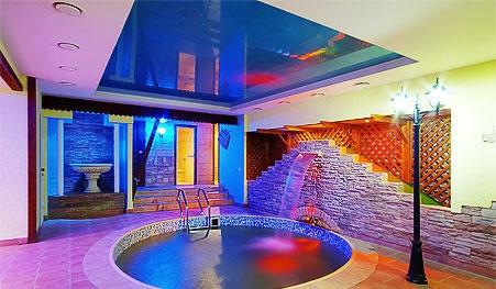 Караоке, теле-, видеоаппаратура, предоставленная для пользования, наилучшим образом скрасит и дополнит любой вид отдыха. Из окна во всю гостиную открывается чудный вид на прекрасным образом оборудованный внутренний двор с подогреваемым бассейном с подсветкой, расположенным на свежем воздухе, а также скрытый от лишних глаз настоящий сеновал. Сруб «Эклектика» идеальным образом сочетает выполненную лучшими индийскими мастерами резную мебель и прекрасный современный дизайн внутреннего помещения.